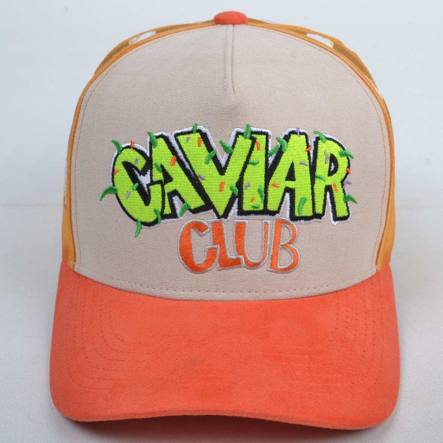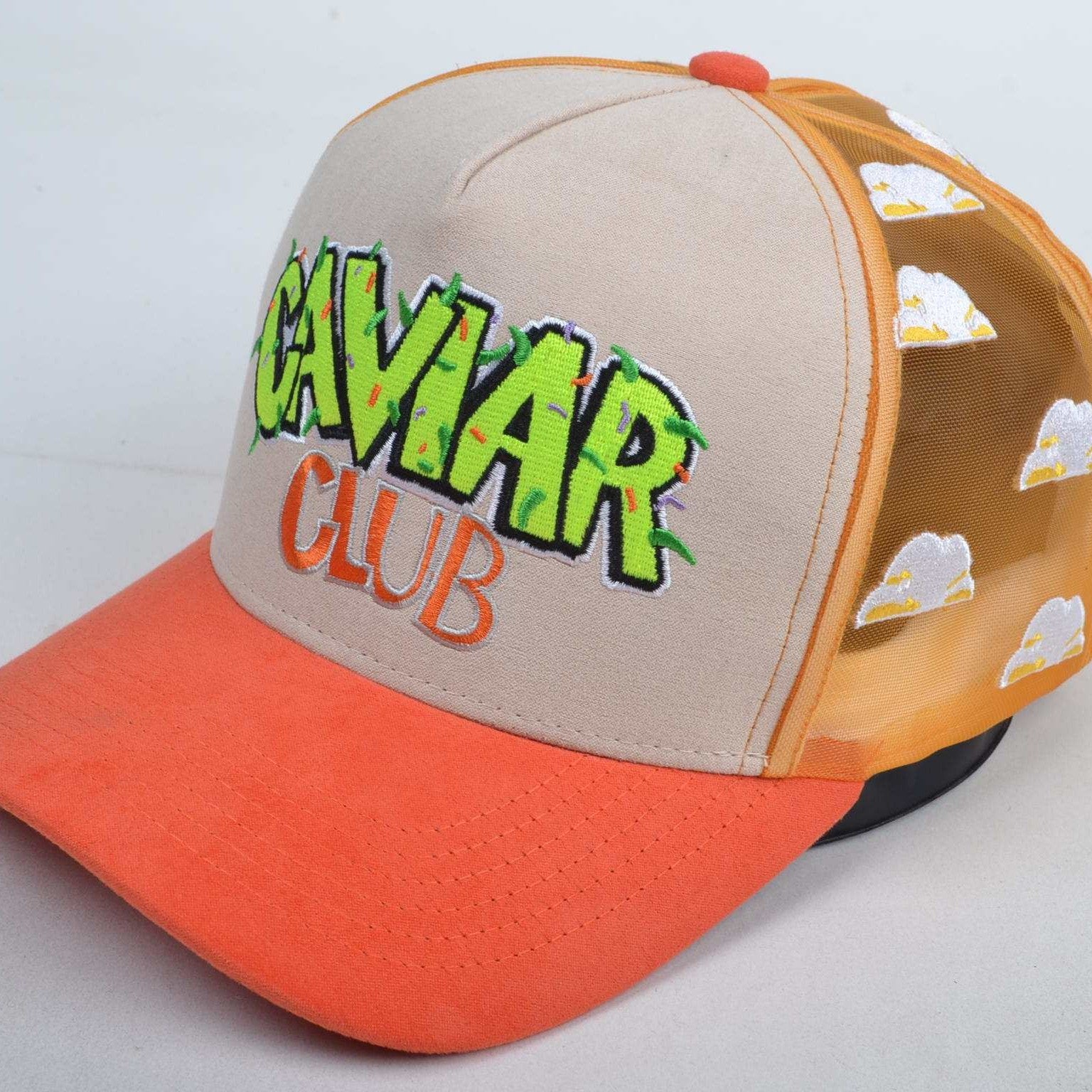 Step into the spotlight with the Cloud Club Trucker Hat – Orange Sherbert Edition, a bold fusion of high design and cultural flavor. Featuring the iconic Caviar Club™ graffiti logo in electric green and vibrant orange embroidery, this hat commands attention while staying true to the club’s roots in creativity and exclusivity.