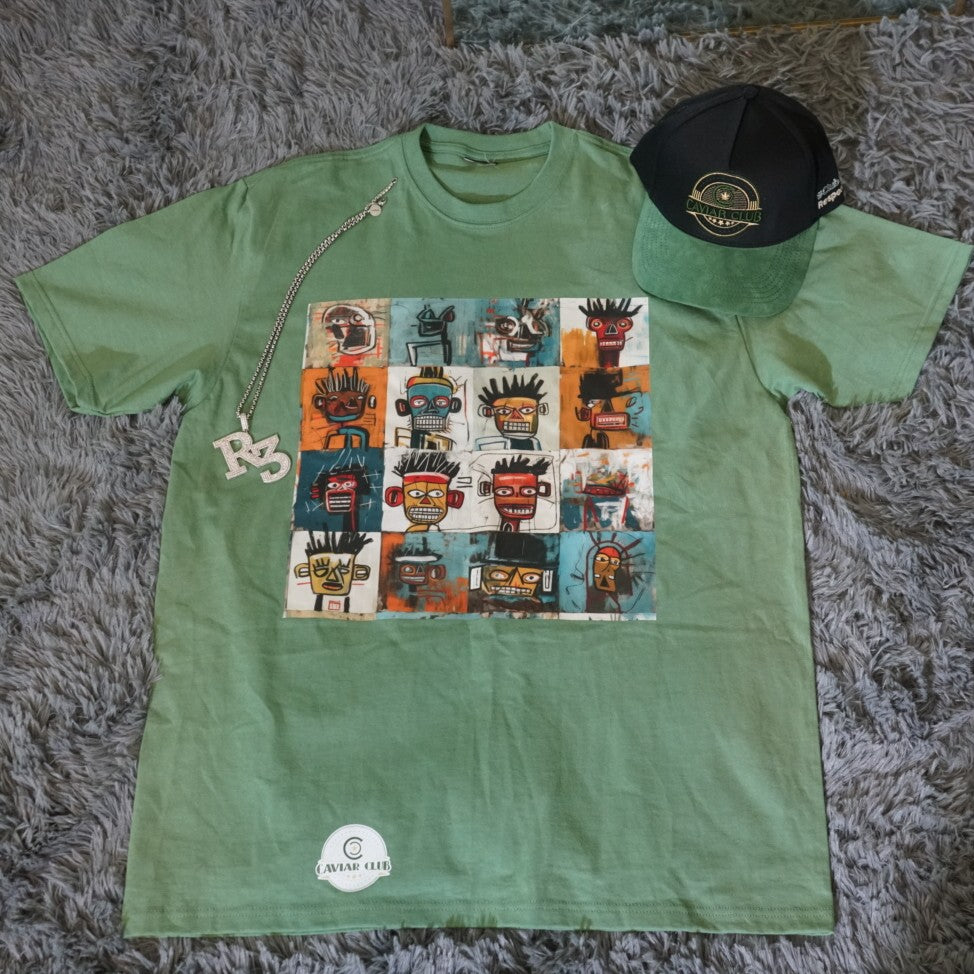Set on a sage green premium cotton tee, the centerpiece is a striking 16-frame art grid inspired by Basquiat—each face a layered story of identity, emotion, and resilience. The shirt is finished with the official Caviar Club™ stamp at the hem, making this a cultural artifact, not just a fit.