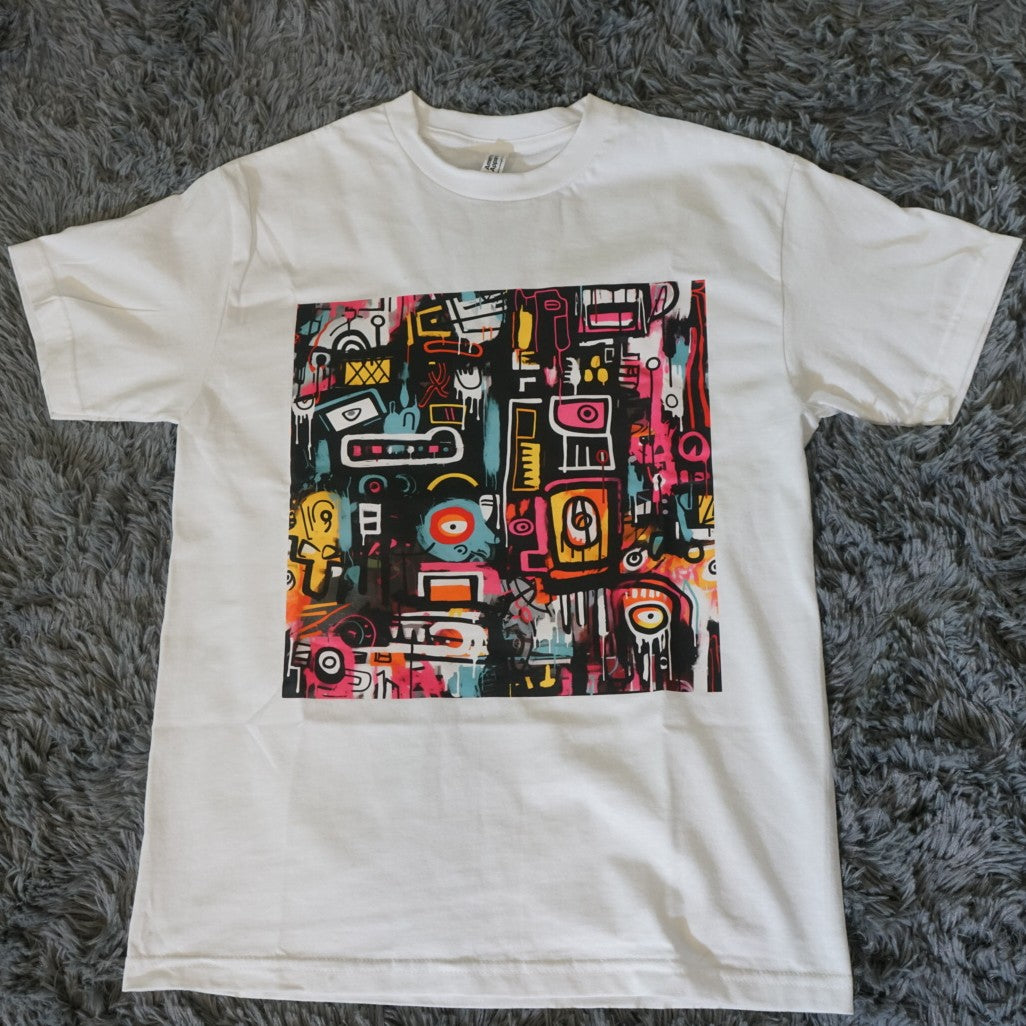 Framed on a crisp white premium cotton tee, the design explodes with layered patterns, punchy neons, and dynamic shapes. It’s streetwear meets modern art—tapping into sonic frequencies, visual memory, and ancestral resonance. Every detail is intentional. Every color, a vibration.