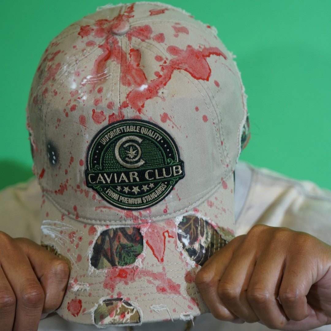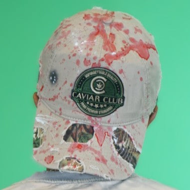 This hat features a battle-worn khaki base drenched in blood-red paint splatter, bullet-hole burn accents, and shredded panels revealing camo underlays beneath the chaos. The bold Caviar Club™ premium patch anchors the carnage with a stamp of authenticity, marking you as part of the elite.